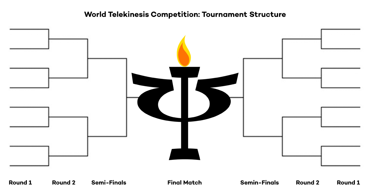 The World Telekinesis Competition operates according to standard single-elimination tournament structure. Teams will be randomly assigned places in the tournament brackets. Winning teams will proceed to the next bracket. Losing teams will be eliminated.